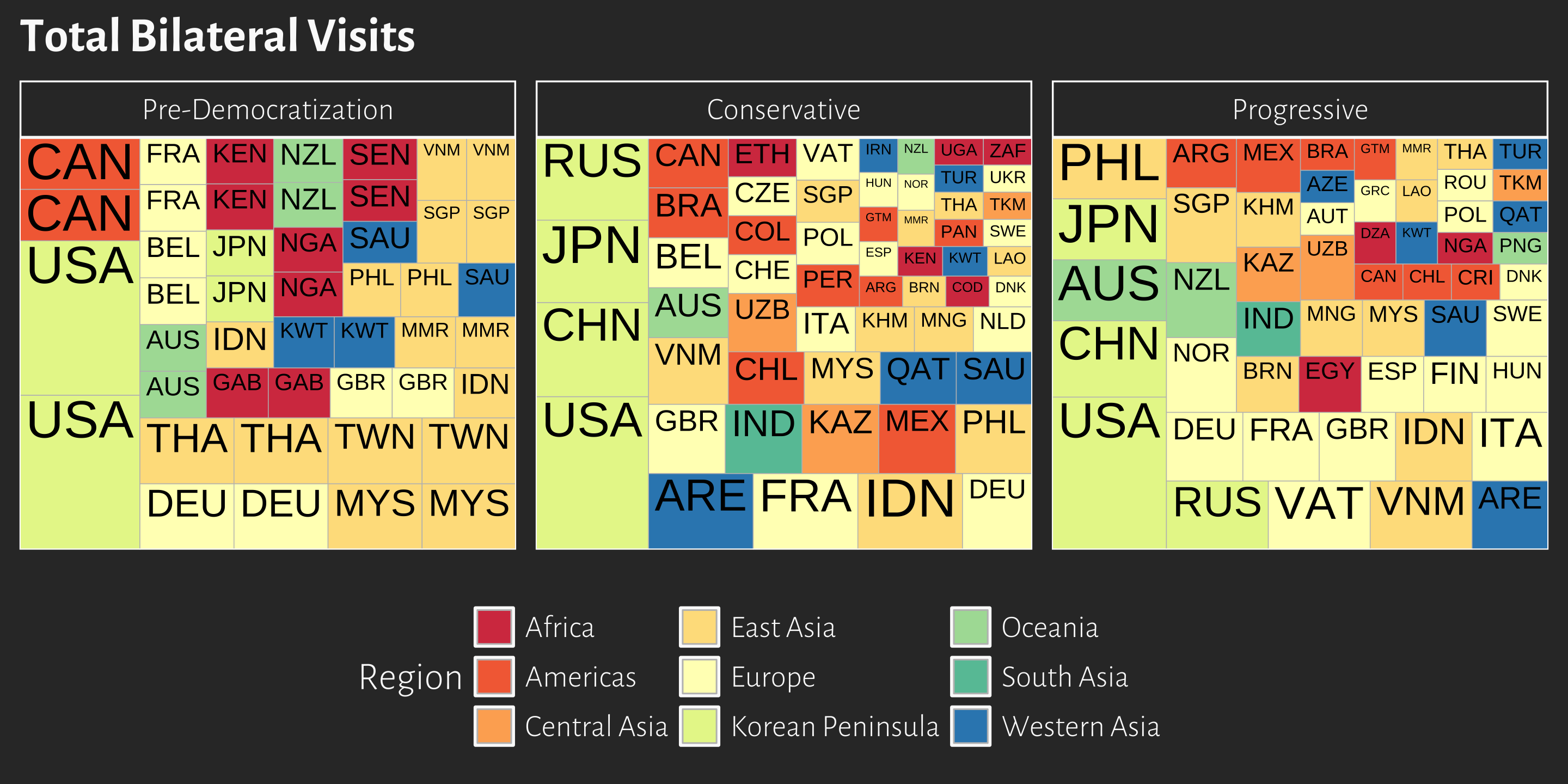 Recently, I have created several novel datasets on Korean diplomacy for my research, mainly focusing on high-level diplomatic visits (both outgoing and incoming), their formats (bilateral, multilateral, informal), nature (such as state visits), purposes (economic, security, etc.), timelines, and the conveners in multilateral contexts among others. I will make these datasets available via a new R package, kdiplo. In this paper, I introduce the data, and the R package as well as analyzing the foreign policy drivers of high-level diplomatic visits (both outgoing and incoming) through Bayesian cross-sectional time-series logistic regression models.